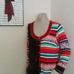Funky mixed printed long sleeved top with scooped neckline, drawstring ties, button front and side pockets!