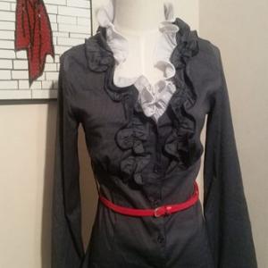PINSTRIPED RUFFLED FRONT BLOUSE SIZE 10