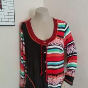 Funky mixed printed long sleeved top with scooped neckline, drawstring ties, button front and side pockets!